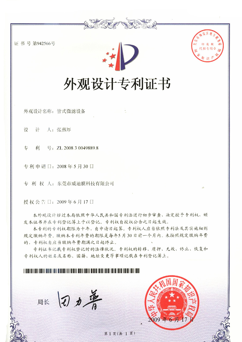 外觀型專利證書管式微濾設備