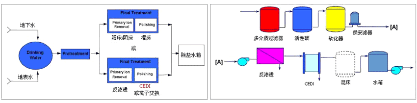 在上圖中,CEDI系統(tǒng)通常作為主要拋光設(shè)備。有時(shí)候出于備用的目的,在CEDI后面會(huì)設(shè)置一個(gè)混床以保證在CEDI系統(tǒng)維護(hù)期間系統(tǒng)仍能生產(chǎn)除鹽水。在CEDI正常工作時(shí),流經(jīng)混床的離子濃度極低,所以混床的更換頻率非常低。